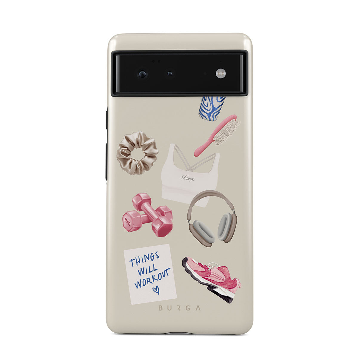 Typické pro tento motiv: činky, sluchátka, termohrnek, kartáč na vlasy, růžové tenisky, sportovní podprsenku, tyčinku Crunchie, samolepku „Things Will Work Out“.