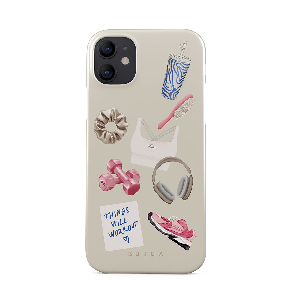 Typické pro tento motiv: činky, sluchátka, termohrnek, kartáč na vlasy, růžové tenisky, sportovní podprsenku, tyčinku Crunchie, samolepku „Things Will Work Out“.