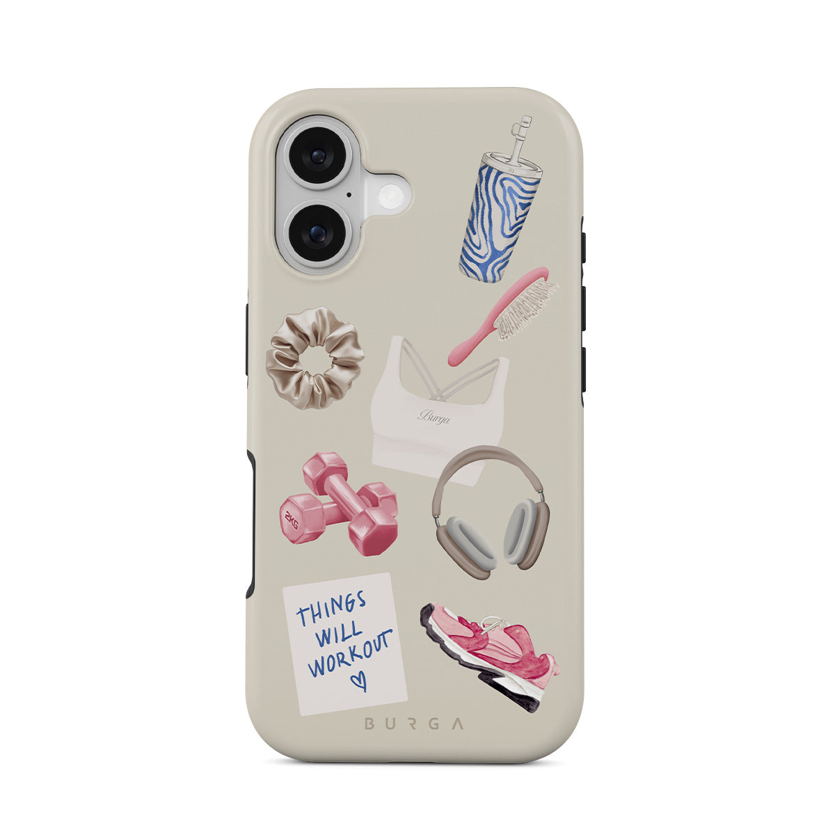 Typické pro tento motiv: činky, sluchátka, termohrnek, kartáč na vlasy, růžové tenisky, sportovní podprsenku, tyčinku Crunchie, samolepku „Things Will Work Out“.