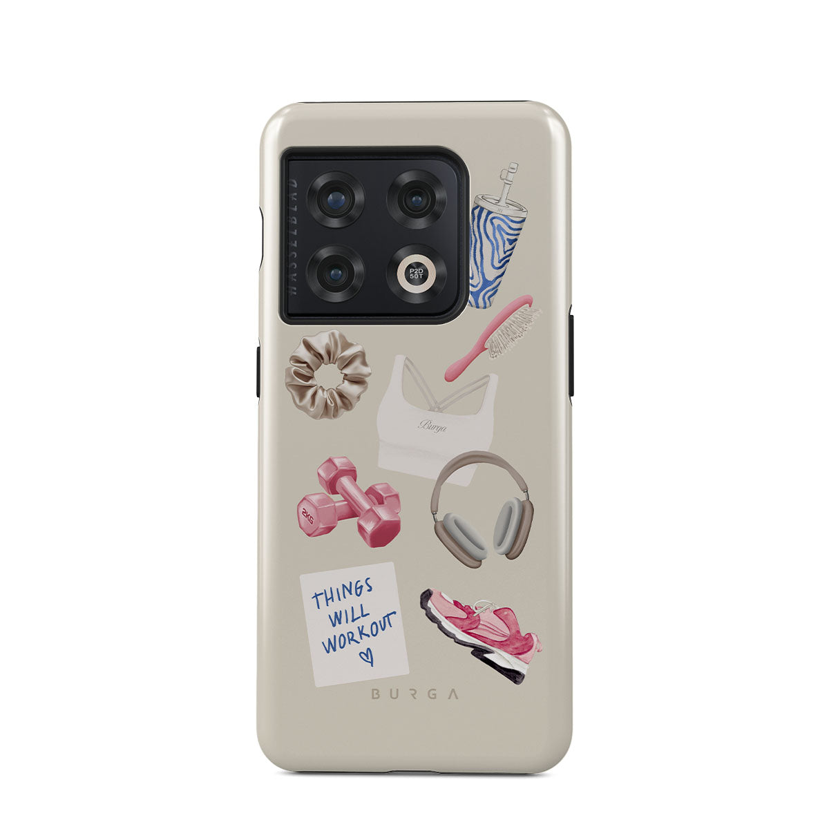 Typické pro tento motiv: činky, sluchátka, termohrnek, kartáč na vlasy, růžové tenisky, sportovní podprsenku, tyčinku Crunchie, samolepku „Things Will Work Out“.