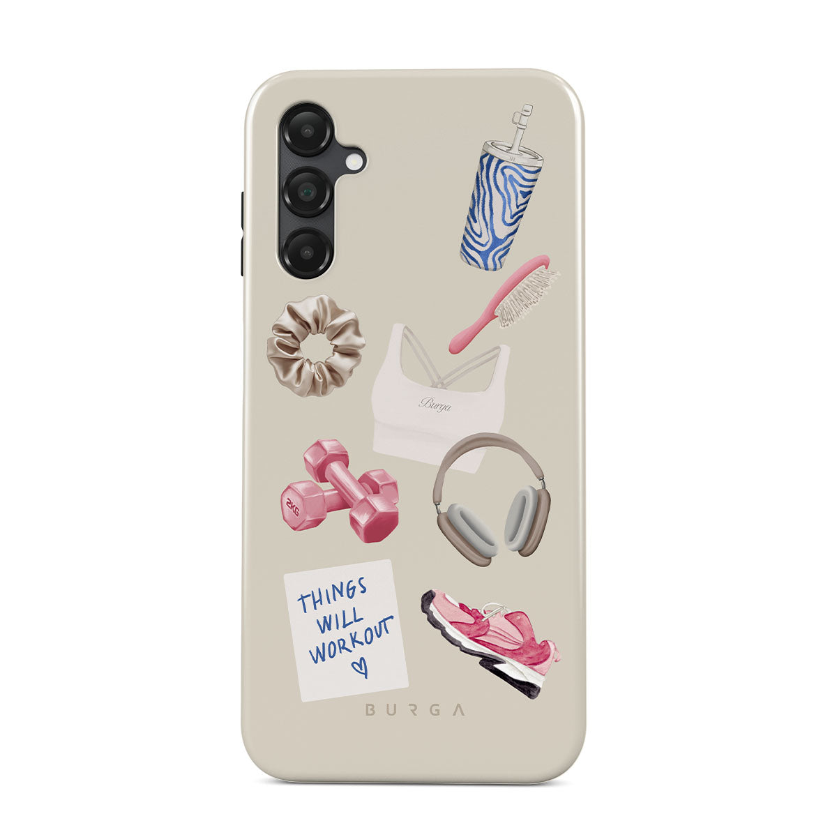 Typické pro tento motiv: činky, sluchátka, termohrnek, kartáč na vlasy, růžové tenisky, sportovní podprsenku, tyčinku Crunchie, samolepku „Things Will Work Out“.