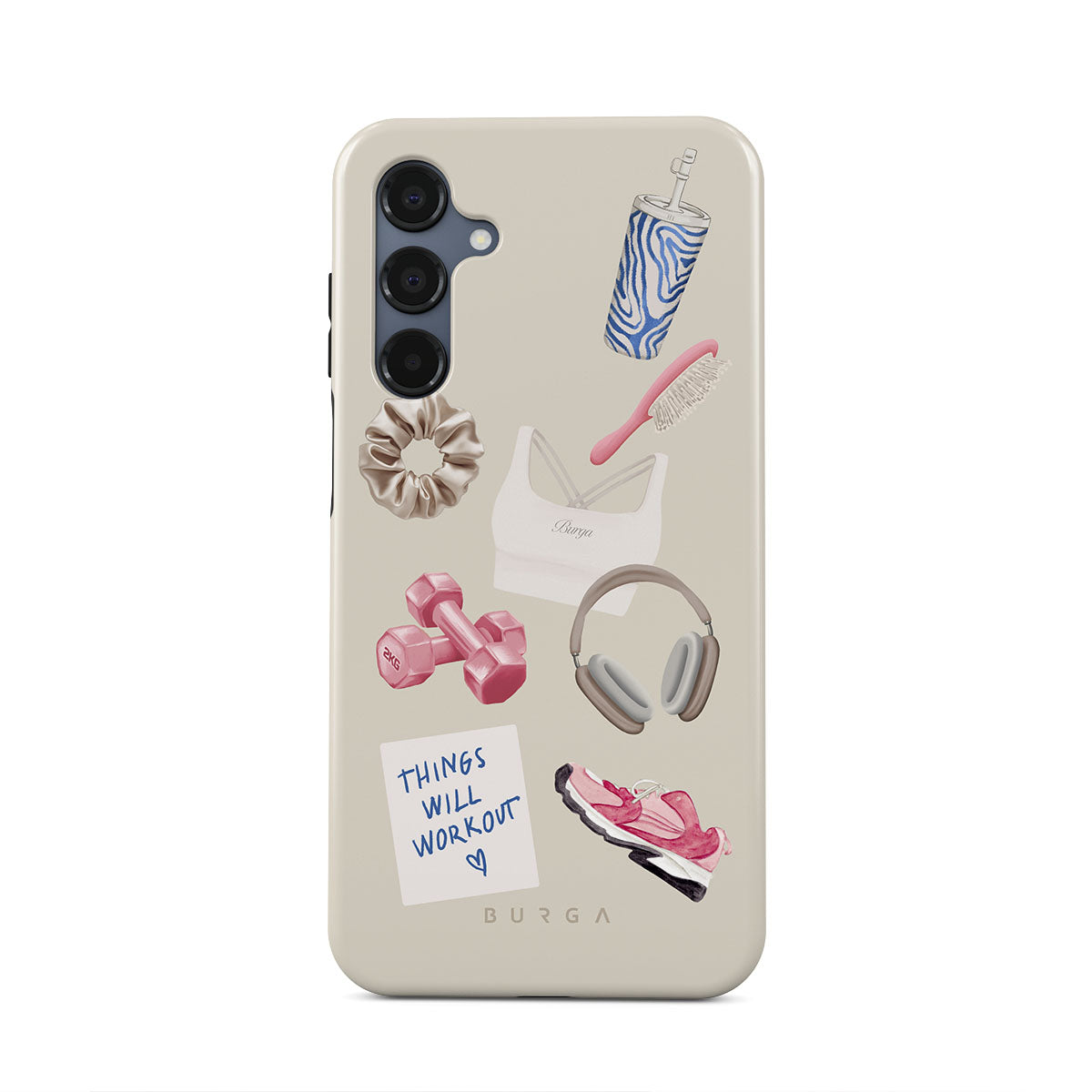 Typické pro tento motiv: činky, sluchátka, termohrnek, kartáč na vlasy, růžové tenisky, sportovní podprsenku, tyčinku Crunchie, samolepku „Things Will Work Out“.