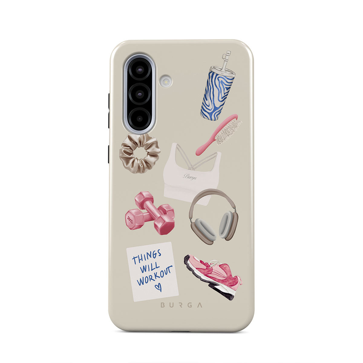 Typické pro tento motiv: činky, sluchátka, termohrnek, kartáč na vlasy, růžové tenisky, sportovní podprsenku, tyčinku Crunchie, samolepku „Things Will Work Out“.