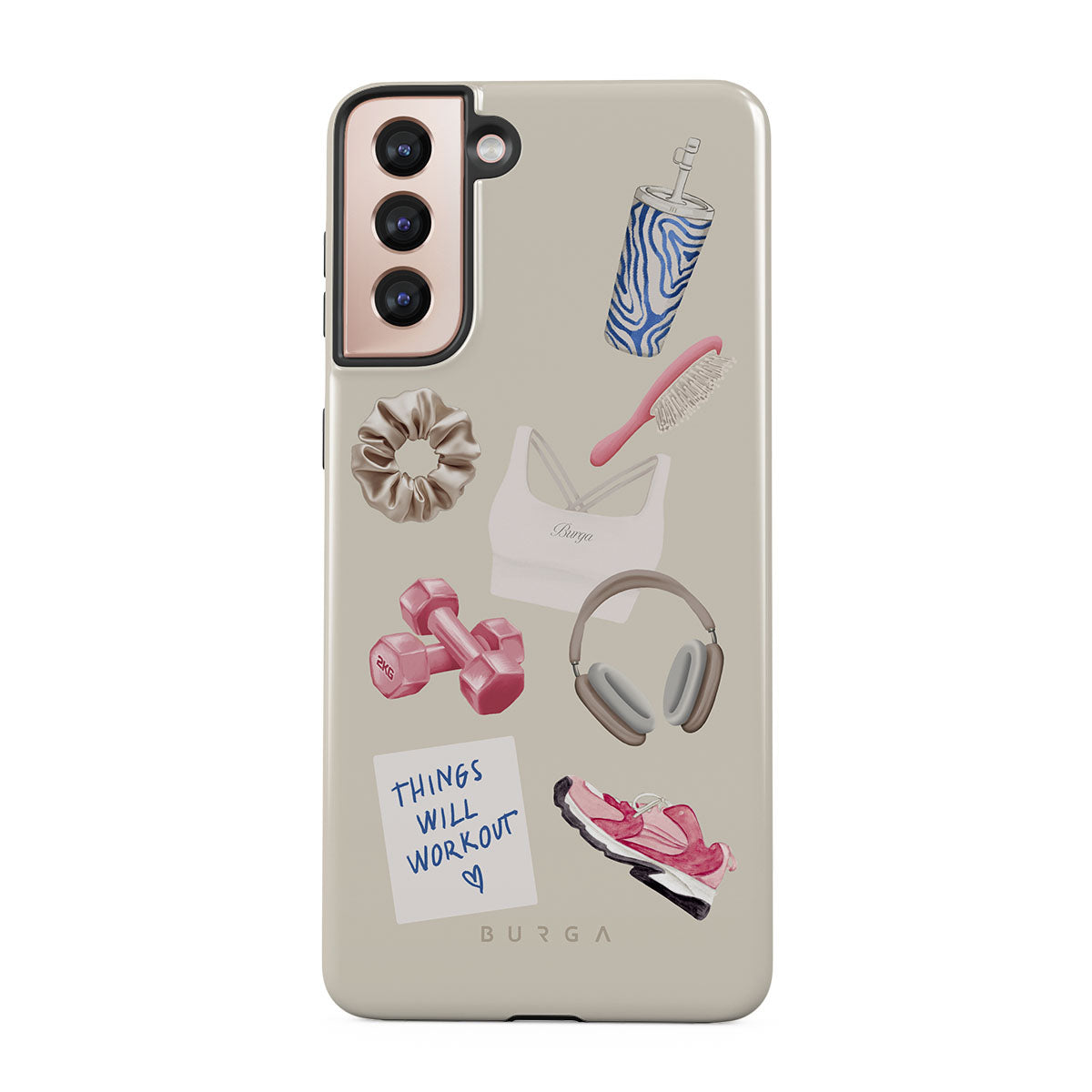 Typické pro tento motiv: činky, sluchátka, termohrnek, kartáč na vlasy, růžové tenisky, sportovní podprsenku, tyčinku Crunchie, samolepku „Things Will Work Out“.