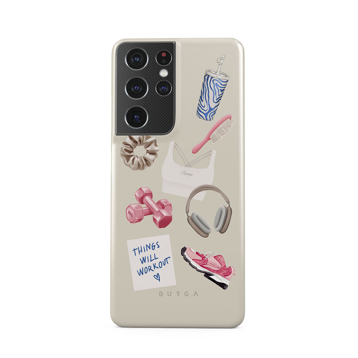 Typické pro tento motiv: činky, sluchátka, termohrnek, kartáč na vlasy, růžové tenisky, sportovní podprsenku, tyčinku Crunchie, samolepku „Things Will Work Out“.