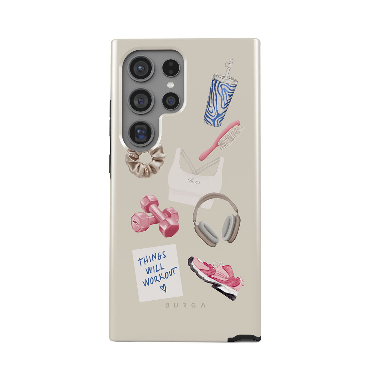 Typické pro tento motiv: činky, sluchátka, termohrnek, kartáč na vlasy, růžové tenisky, sportovní podprsenku, tyčinku Crunchie, samolepku „Things Will Work Out“.
