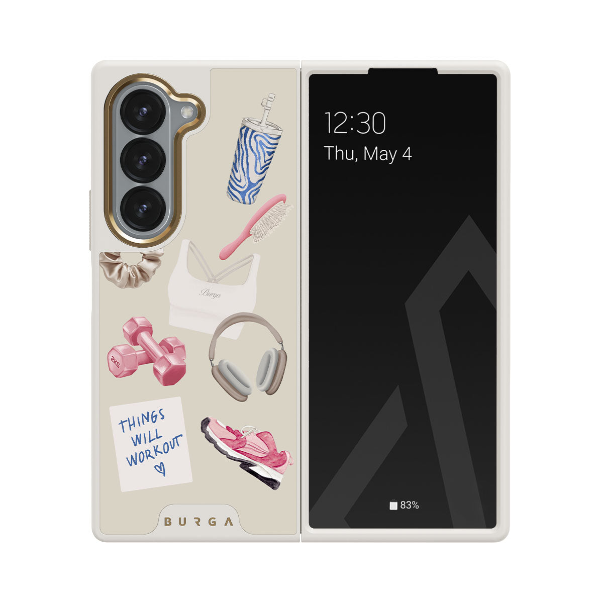 Typické pro tento motiv: činky, sluchátka, termohrnek, kartáč na vlasy, růžové tenisky, sportovní podprsenku, tyčinku Crunchie, samolepku „Things Will Work Out“.
