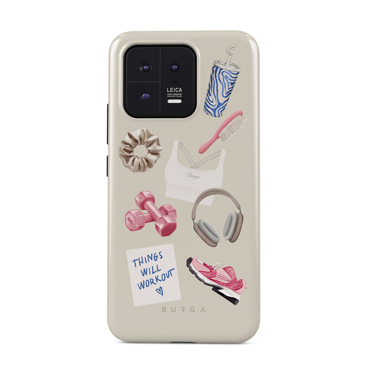 Typické pro tento motiv: činky, sluchátka, termohrnek, kartáč na vlasy, růžové tenisky, sportovní podprsenku, tyčinku Crunchie, samolepku „Things Will Work Out“.
