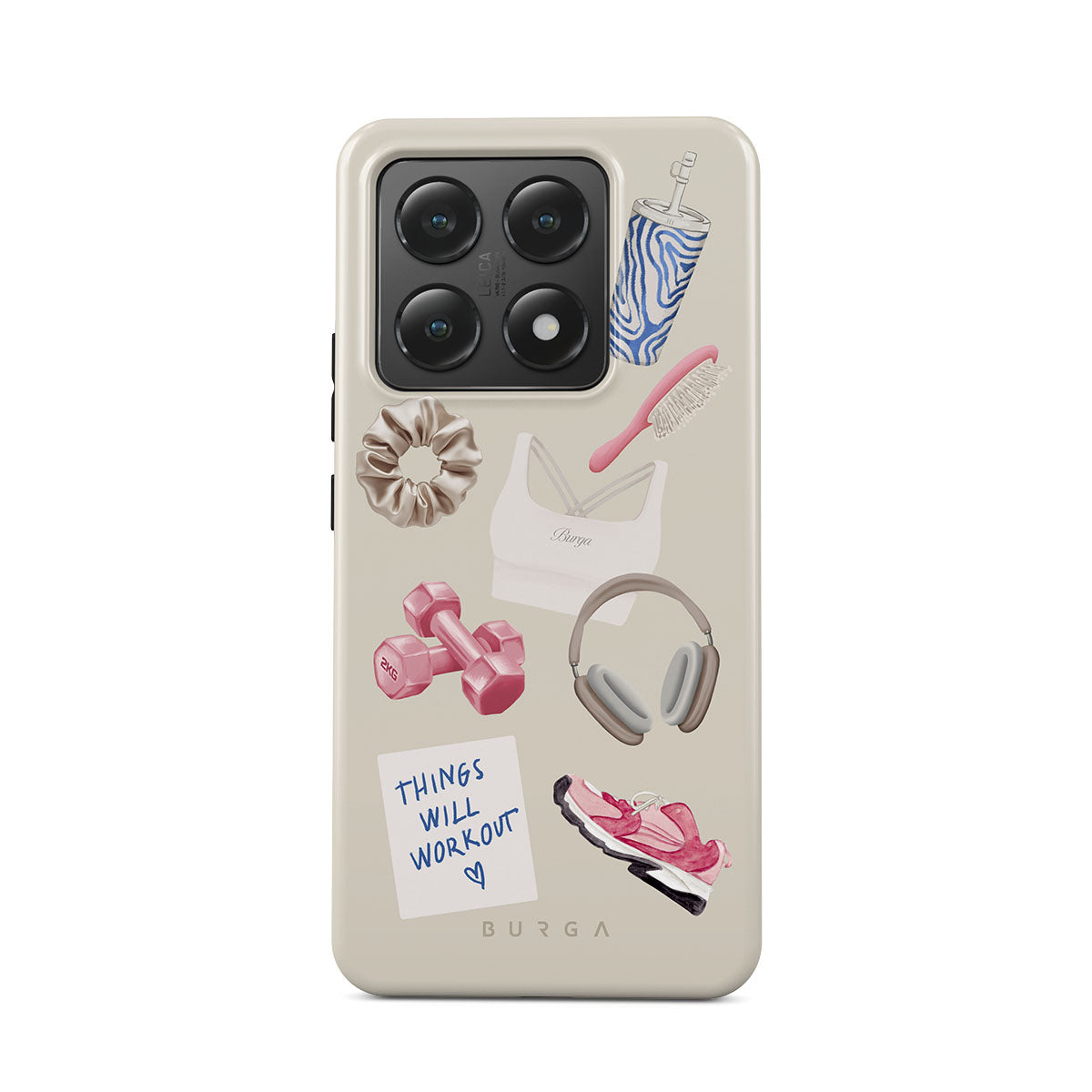 Typické pro tento motiv: činky, sluchátka, termohrnek, kartáč na vlasy, růžové tenisky, sportovní podprsenku, tyčinku Crunchie, samolepku „Things Will Work Out“.