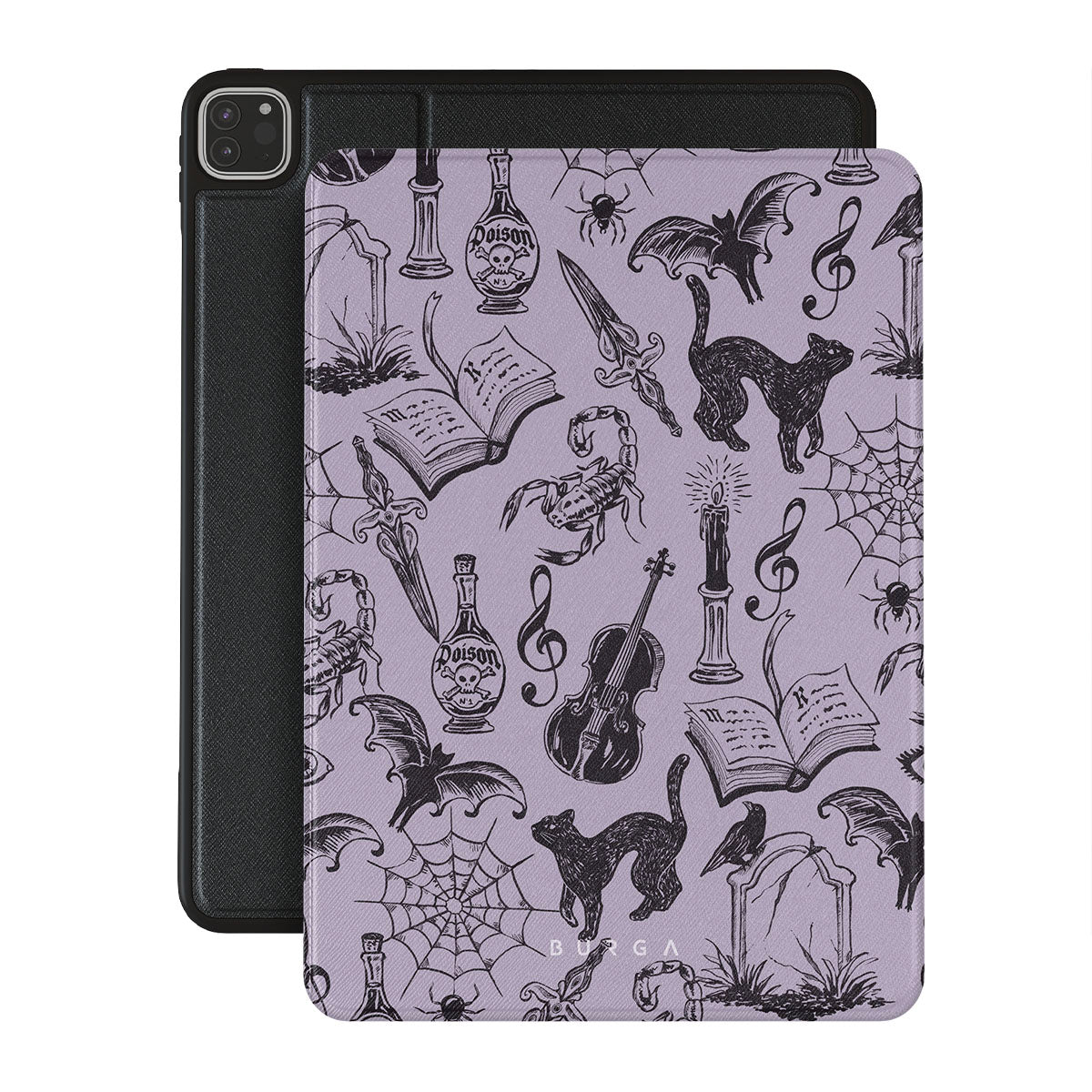 Typické pro tento motiv: gotické kresby, mystické prvky, pavouky, pavučinu, kočku, housle, oko, svíčku, dýku, knihu, netopýra, havrana, štíra