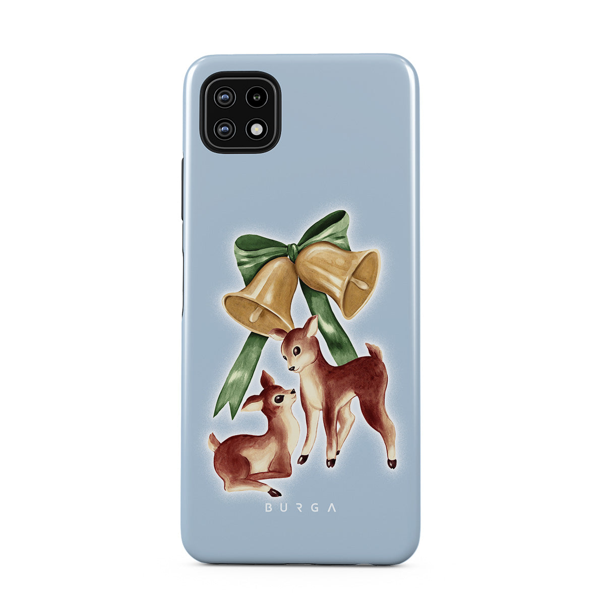 Typické pro tento motiv: vintage sob, vánoční zvonky, zlaté zvonky, retro ilustrace soba, malý jelen, světle modré pozadí