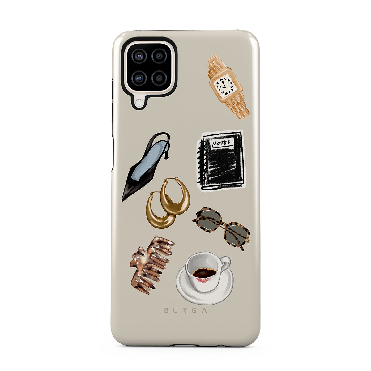 Typické pro tento motiv: černý vysoký podpatek, zlaté kruhové náušnice, černý zápisník, šálek kávy, brýle se želvovinovým vzorem, hnědou scrunchie, retro zlaté hodinky.
