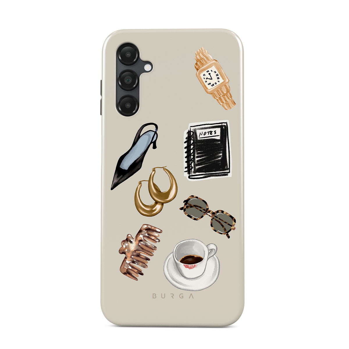 Typické pro tento motiv: černý vysoký podpatek, zlaté kruhové náušnice, černý zápisník, šálek kávy, brýle se želvovinovým vzorem, hnědou scrunchie, retro zlaté hodinky.