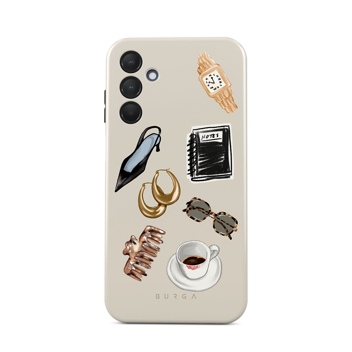 Typické pro tento motiv: černý vysoký podpatek, zlaté kruhové náušnice, černý zápisník, šálek kávy, brýle se želvovinovým vzorem, hnědou scrunchie, retro zlaté hodinky.