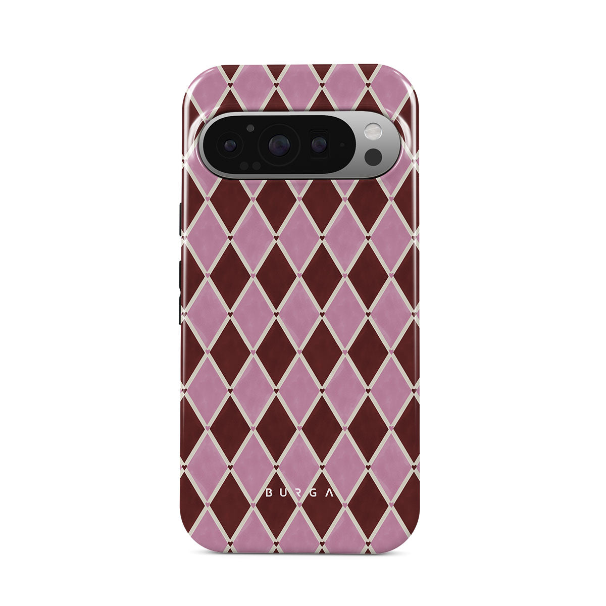 Typické pro tento motiv: harlekýnský vzor, růžové diamanty, tmavě červené pozadí