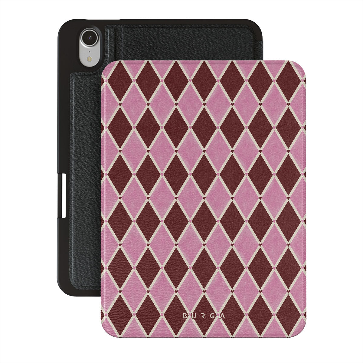 Typické pro tento motiv: harlekýnský vzor, růžové diamanty, tmavě červené pozadí