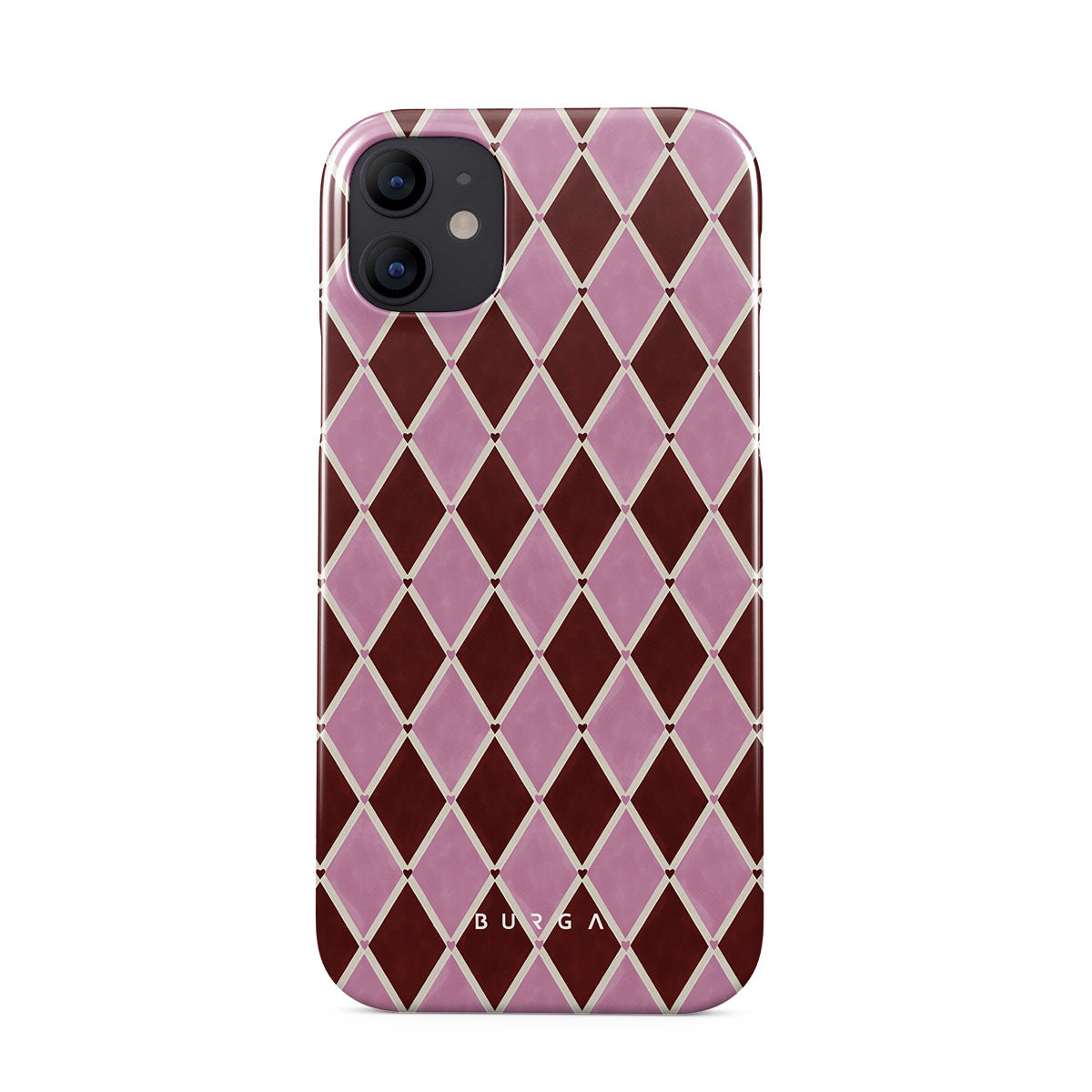 Typické pro tento motiv: harlekýnský vzor, růžové diamanty, tmavě červené pozadí