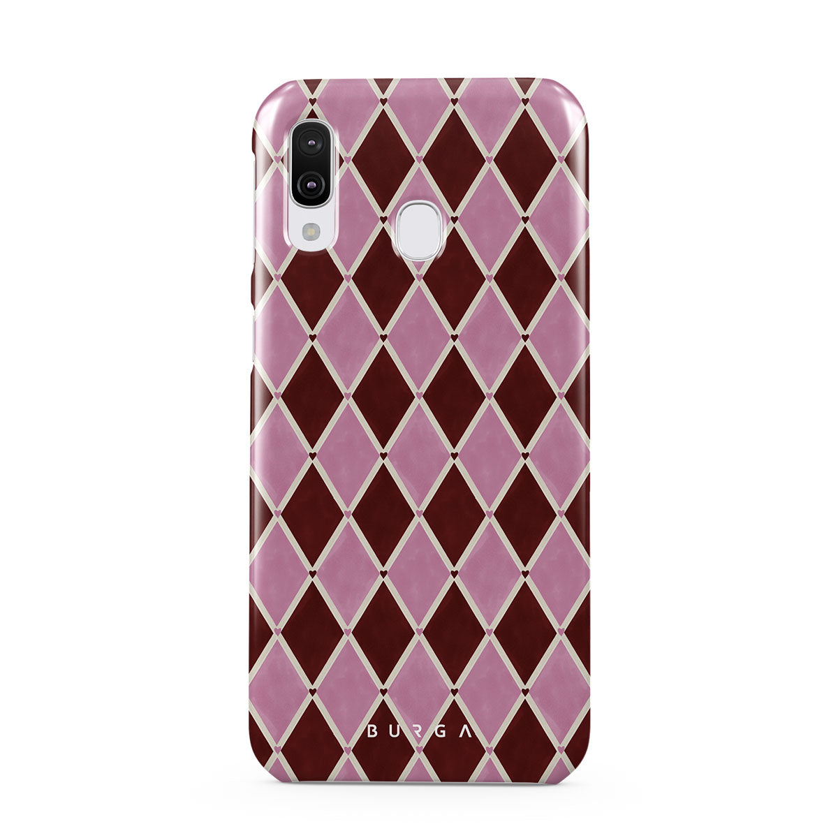 Typické pro tento motiv: harlekýnský vzor, růžové diamanty, tmavě červené pozadí