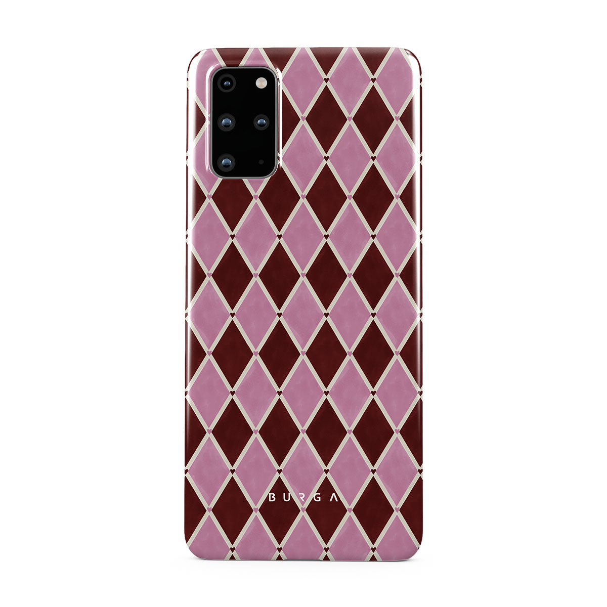 Typické pro tento motiv: harlekýnský vzor, růžové diamanty, tmavě červené pozadí