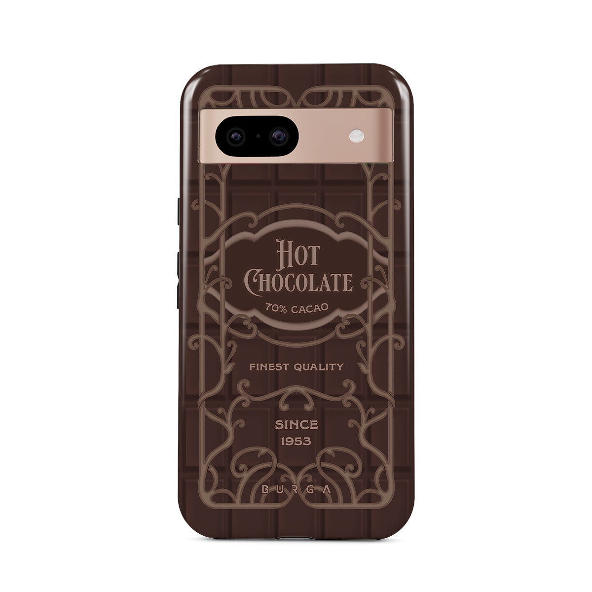 Typické pro tento motiv: štítek s horkou čokoládou, hnědý čokoládový design, retro obalový styl