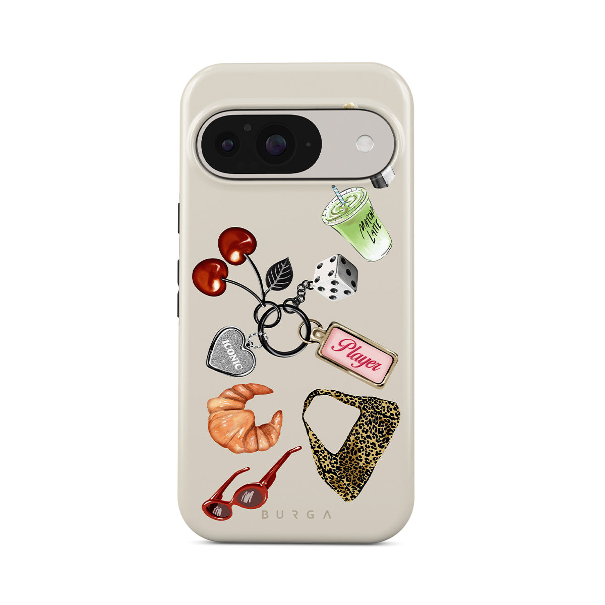 Typické pro tento motiv: červené sluneční brýle, červenou rtěnku, zelený matcha nápoj, croissant, černé kostky, kabelku s leopardím vzorem, klíčenku se stříbrným srdcem, třešně, kostky a visačku „Player“.
