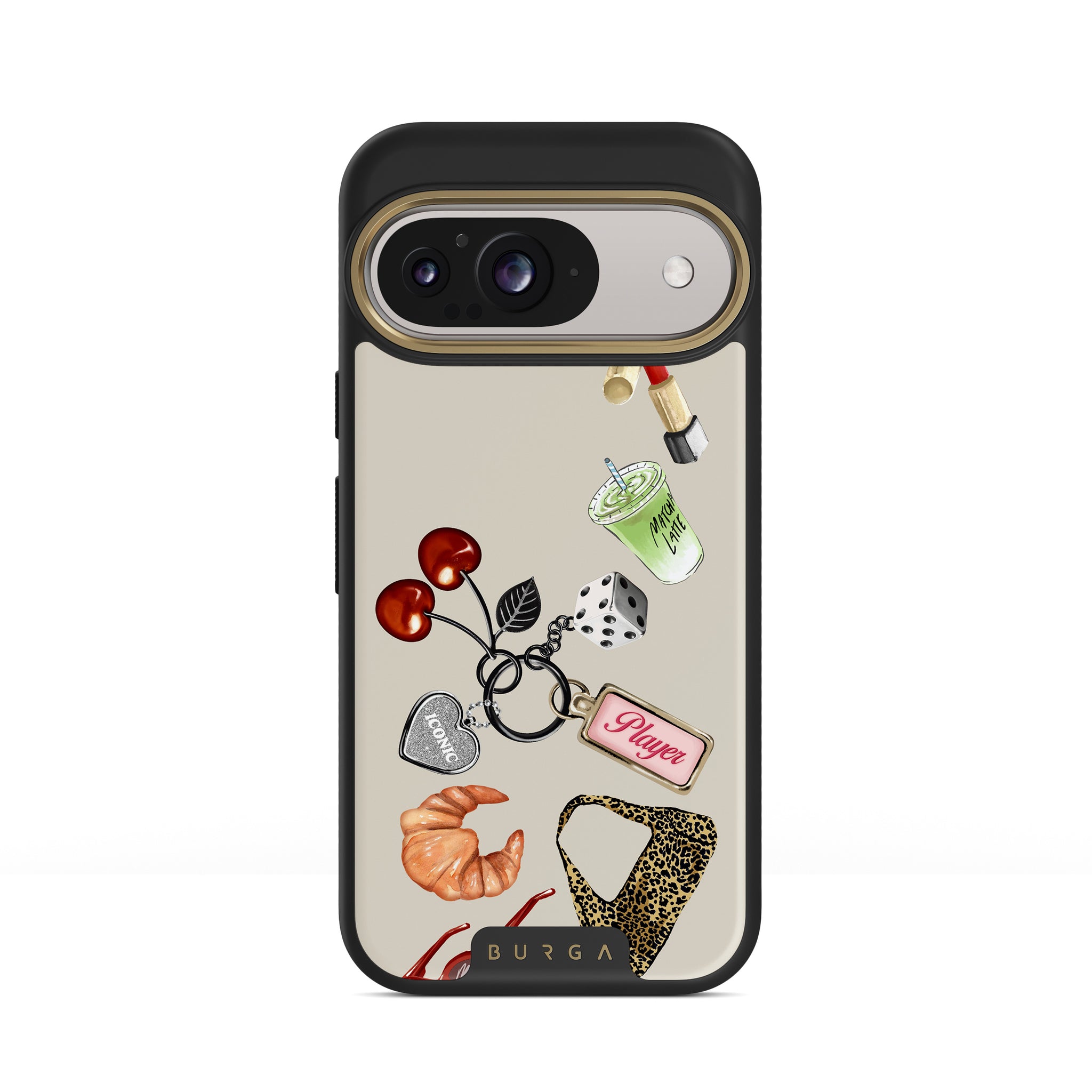 Typické pro tento motiv: červené sluneční brýle, červenou rtěnku, zelený matcha nápoj, croissant, černé kostky, kabelku s leopardím vzorem, klíčenku se stříbrným srdcem, třešně, kostky a visačku „Player“.