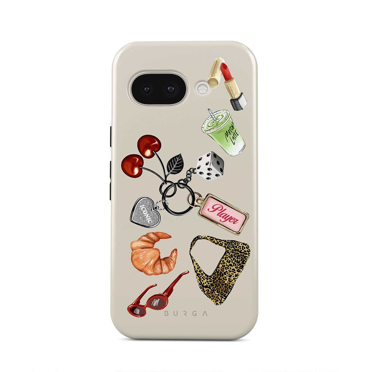 Typické pro tento motiv: červené sluneční brýle, červenou rtěnku, zelený matcha nápoj, croissant, černé kostky, kabelku s leopardím vzorem, klíčenku se stříbrným srdcem, třešně, kostky a visačku „Player“.