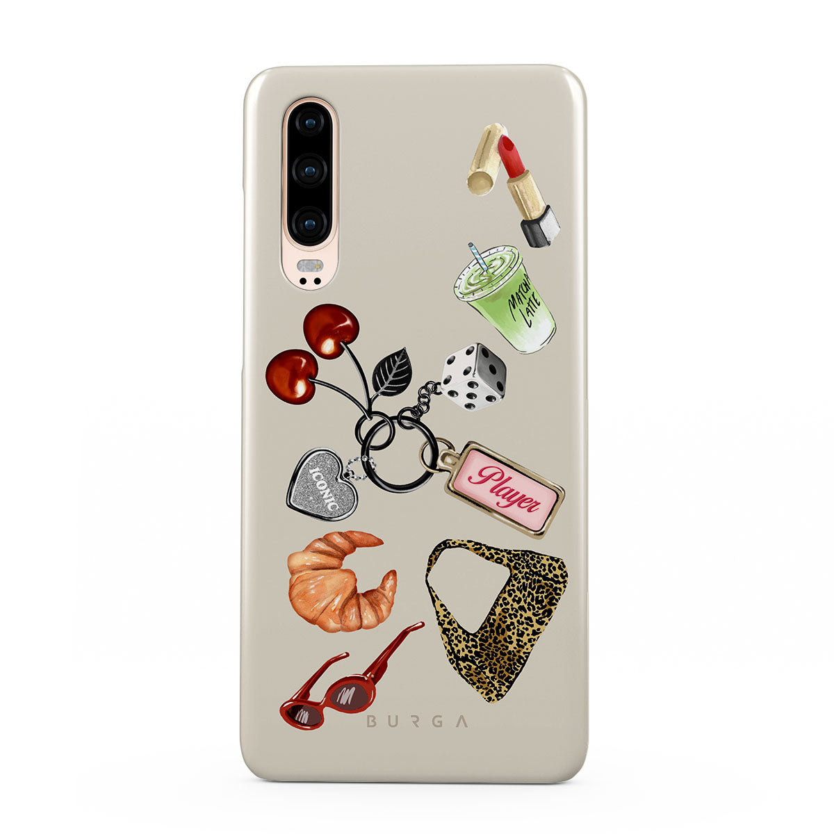 Typické pro tento motiv: červené sluneční brýle, červenou rtěnku, zelený matcha nápoj, croissant, černé kostky, kabelku s leopardím vzorem, klíčenku se stříbrným srdcem, třešně, kostky a visačku „Player“.