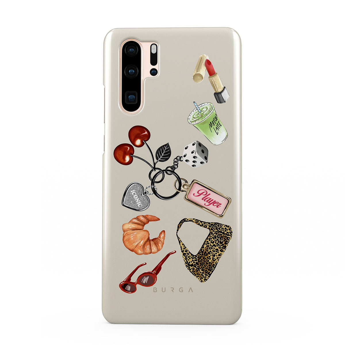 Typické pro tento motiv: červené sluneční brýle, červenou rtěnku, zelený matcha nápoj, croissant, černé kostky, kabelku s leopardím vzorem, klíčenku se stříbrným srdcem, třešně, kostky a visačku „Player“.
