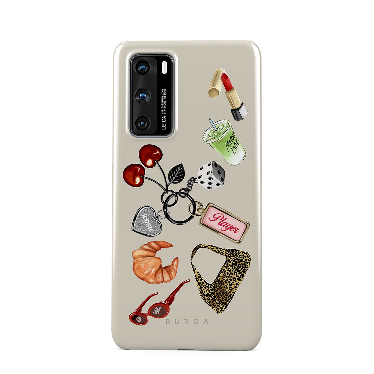 Typické pro tento motiv: červené sluneční brýle, červenou rtěnku, zelený matcha nápoj, croissant, černé kostky, kabelku s leopardím vzorem, klíčenku se stříbrným srdcem, třešně, kostky a visačku „Player“.