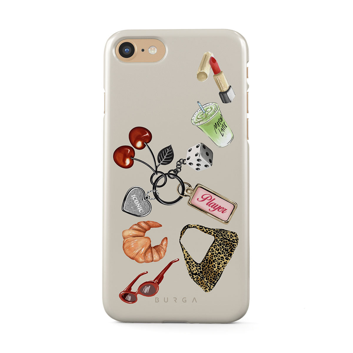 Typické pro tento motiv: červené sluneční brýle, červenou rtěnku, zelený matcha nápoj, croissant, černé kostky, kabelku s leopardím vzorem, klíčenku se stříbrným srdcem, třešně, kostky a visačku „Player“.
