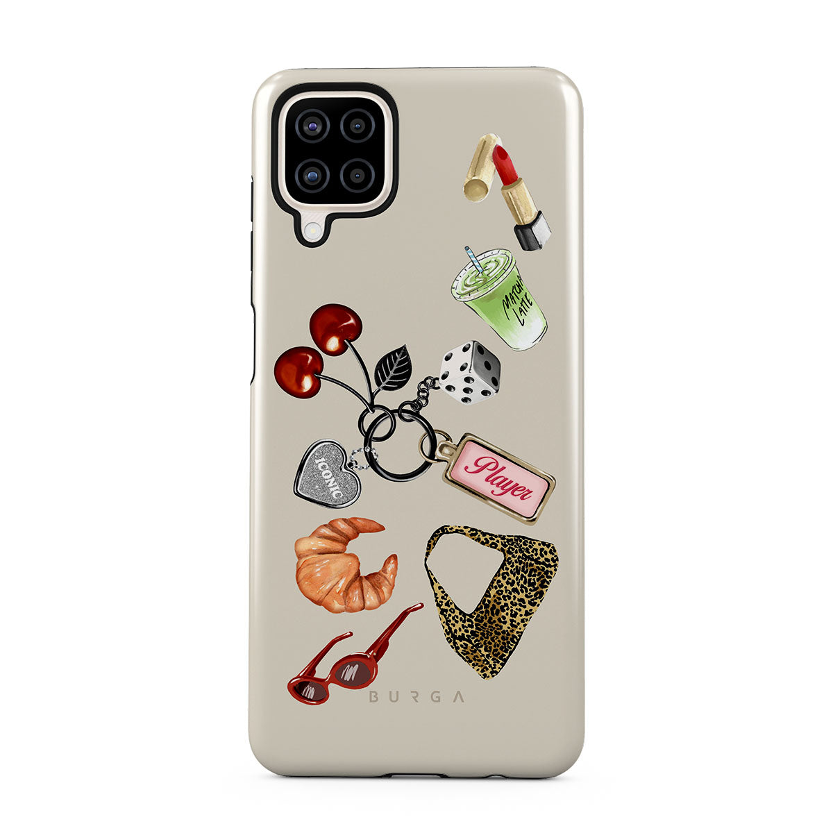 Typické pro tento motiv: červené sluneční brýle, červenou rtěnku, zelený matcha nápoj, croissant, černé kostky, kabelku s leopardím vzorem, klíčenku se stříbrným srdcem, třešně, kostky a visačku „Player“.