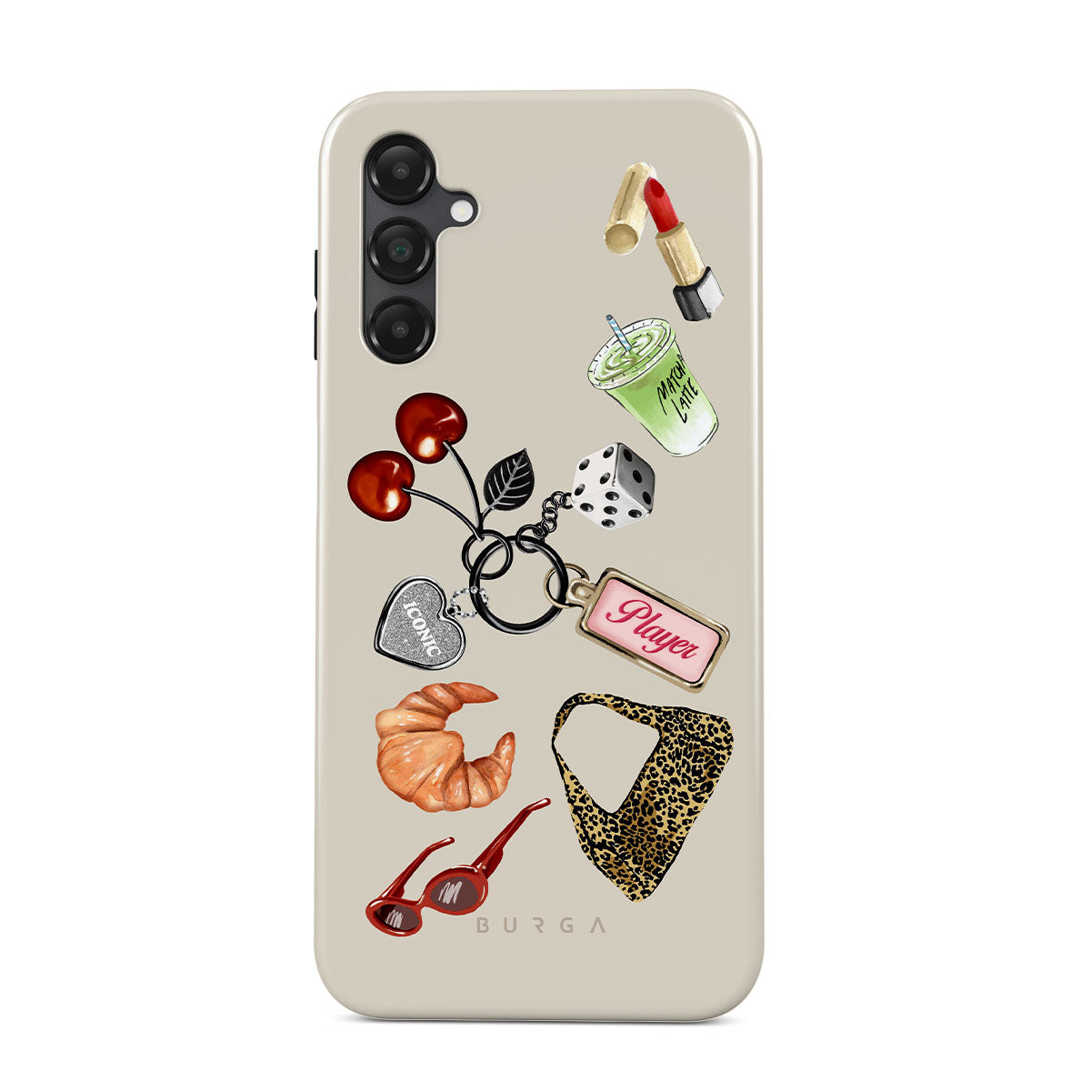 Typické pro tento motiv: červené sluneční brýle, červenou rtěnku, zelený matcha nápoj, croissant, černé kostky, kabelku s leopardím vzorem, klíčenku se stříbrným srdcem, třešně, kostky a visačku „Player“.