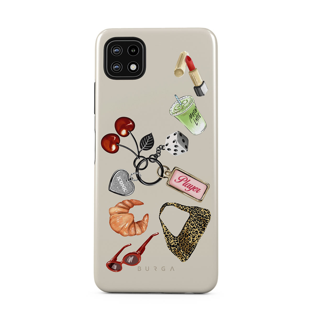 Typické pro tento motiv: červené sluneční brýle, červenou rtěnku, zelený matcha nápoj, croissant, černé kostky, kabelku s leopardím vzorem, klíčenku se stříbrným srdcem, třešně, kostky a visačku „Player“.
