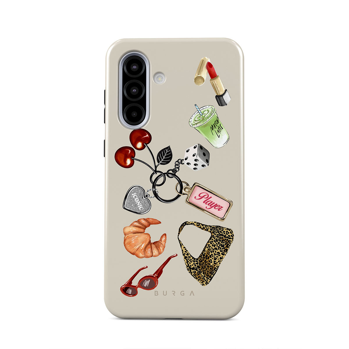 Typické pro tento motiv: červené sluneční brýle, červenou rtěnku, zelený matcha nápoj, croissant, černé kostky, kabelku s leopardím vzorem, klíčenku se stříbrným srdcem, třešně, kostky a visačku „Player“.