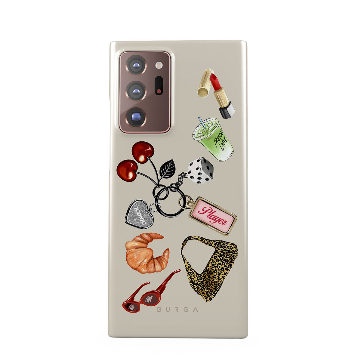Typické pro tento motiv: červené sluneční brýle, červenou rtěnku, zelený matcha nápoj, croissant, černé kostky, kabelku s leopardím vzorem, klíčenku se stříbrným srdcem, třešně, kostky a visačku „Player“.