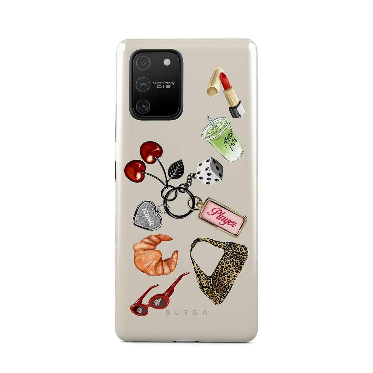 Typické pro tento motiv: červené sluneční brýle, červenou rtěnku, zelený matcha nápoj, croissant, černé kostky, kabelku s leopardím vzorem, klíčenku se stříbrným srdcem, třešně, kostky a visačku „Player“.