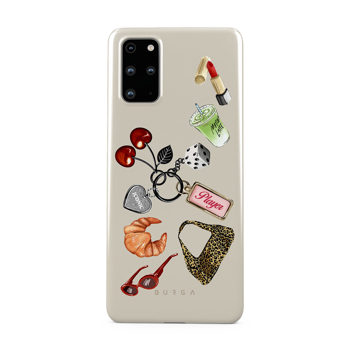 Typické pro tento motiv: červené sluneční brýle, červenou rtěnku, zelený matcha nápoj, croissant, černé kostky, kabelku s leopardím vzorem, klíčenku se stříbrným srdcem, třešně, kostky a visačku „Player“.