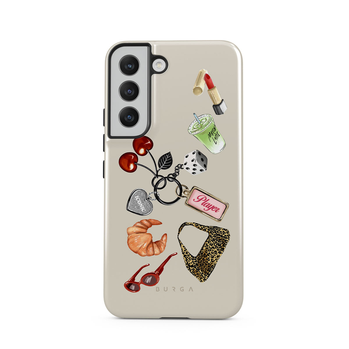 Typické pro tento motiv: červené sluneční brýle, červenou rtěnku, zelený matcha nápoj, croissant, černé kostky, kabelku s leopardím vzorem, klíčenku se stříbrným srdcem, třešně, kostky a visačku „Player“.