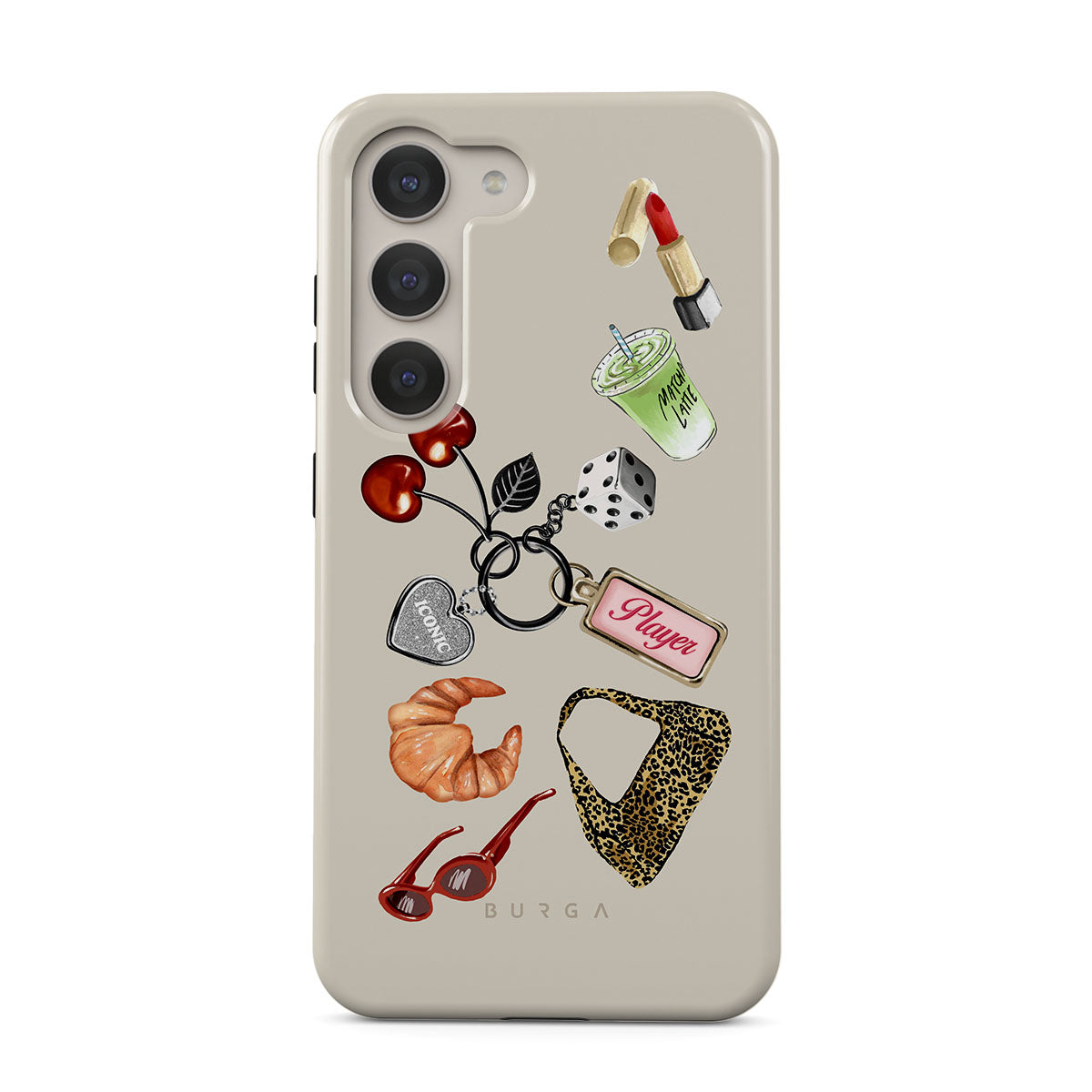 Typické pro tento motiv: červené sluneční brýle, červenou rtěnku, zelený matcha nápoj, croissant, černé kostky, kabelku s leopardím vzorem, klíčenku se stříbrným srdcem, třešně, kostky a visačku „Player“.