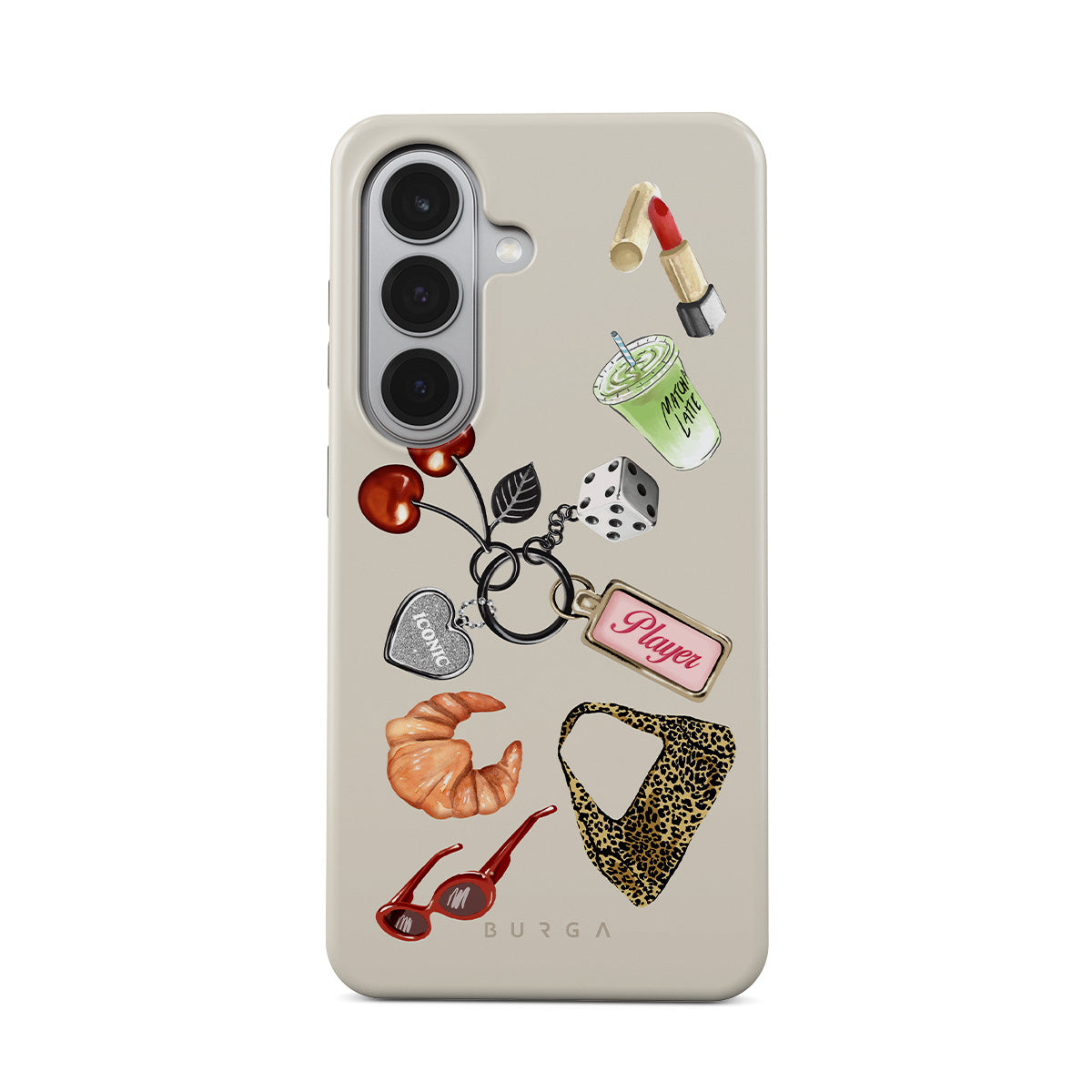 Typické pro tento motiv: červené sluneční brýle, červenou rtěnku, zelený matcha nápoj, croissant, černé kostky, kabelku s leopardím vzorem, klíčenku se stříbrným srdcem, třešně, kostky a visačku „Player“.