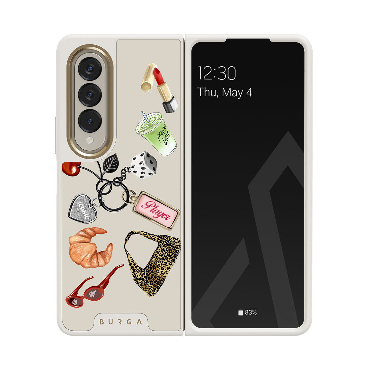 Typické pro tento motiv: červené sluneční brýle, červenou rtěnku, zelený matcha nápoj, croissant, černé kostky, kabelku s leopardím vzorem, klíčenku se stříbrným srdcem, třešně, kostky a visačku „Player“.