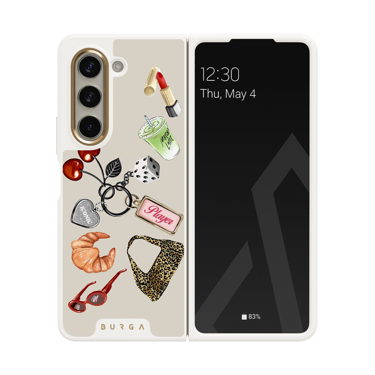 Typické pro tento motiv: červené sluneční brýle, červenou rtěnku, zelený matcha nápoj, croissant, černé kostky, kabelku s leopardím vzorem, klíčenku se stříbrným srdcem, třešně, kostky a visačku „Player“.