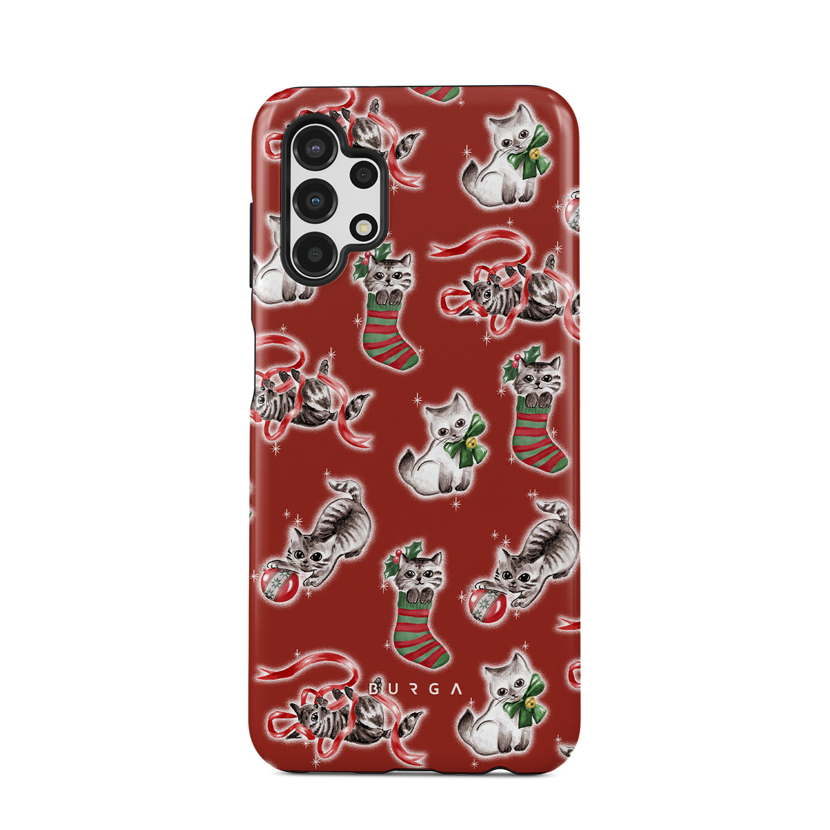 Typické pro tento motiv: kočky, vánoční punčochy, koťata, červený a zelený vzor, hravé kočky, vánoční ozdoby