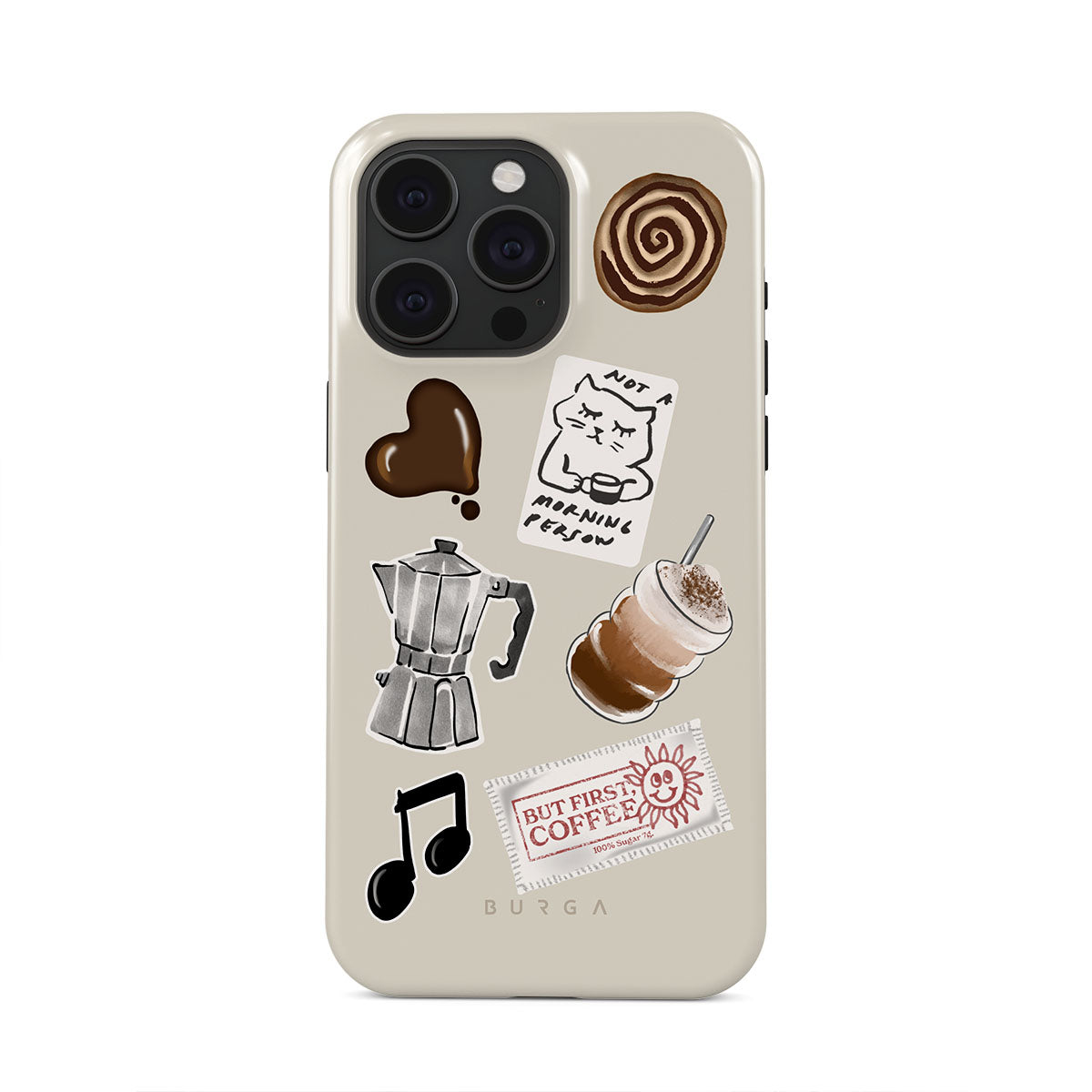 Typické pro tento motiv: moka konvičku, frappé, skořicovou rolku, čokoládové srdce, samolepku „Not a morning person“, účtenku „But First, Coffee“, notu.