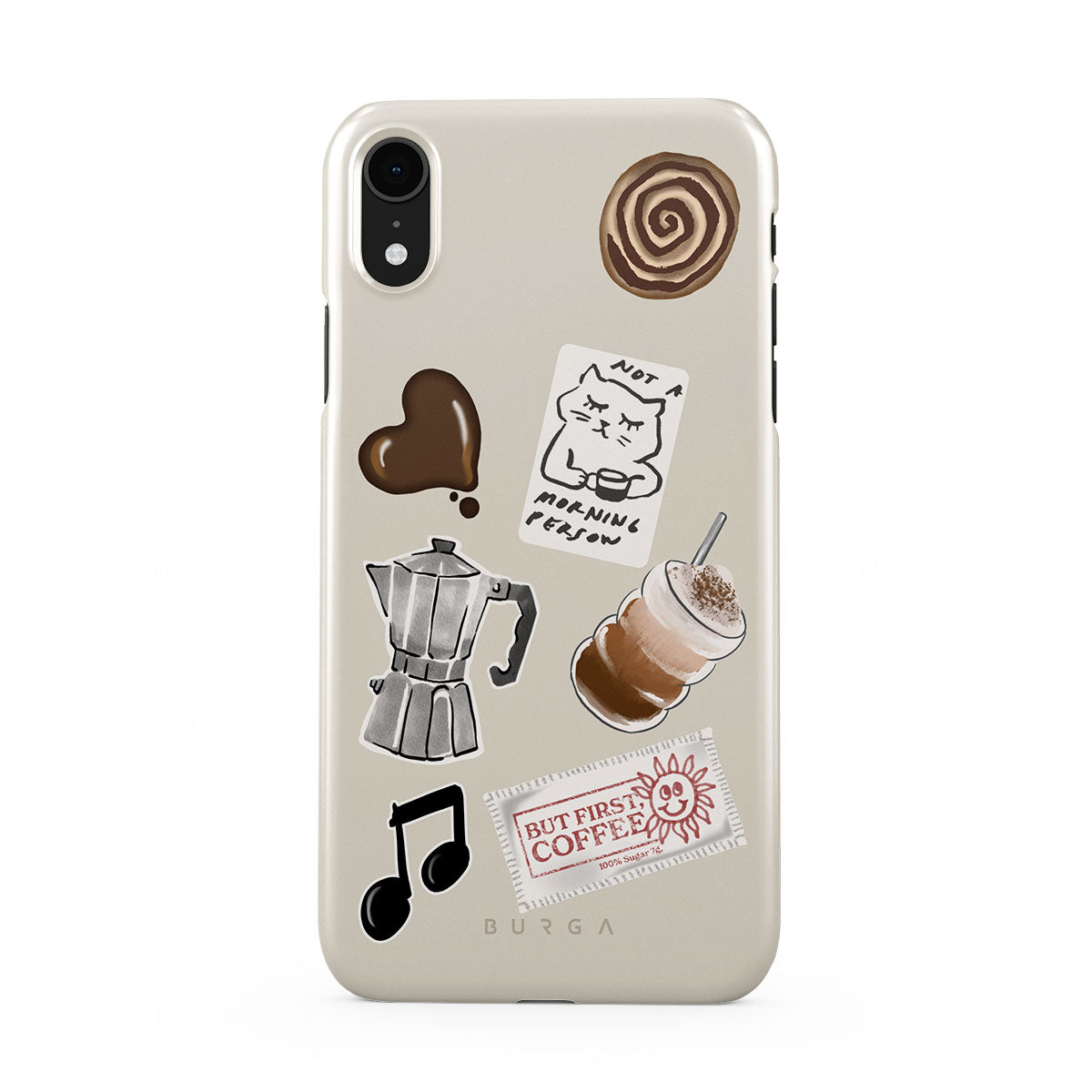 Typické pro tento motiv: moka konvičku, frappé, skořicovou rolku, čokoládové srdce, samolepku „Not a morning person“, účtenku „But First, Coffee“, notu.