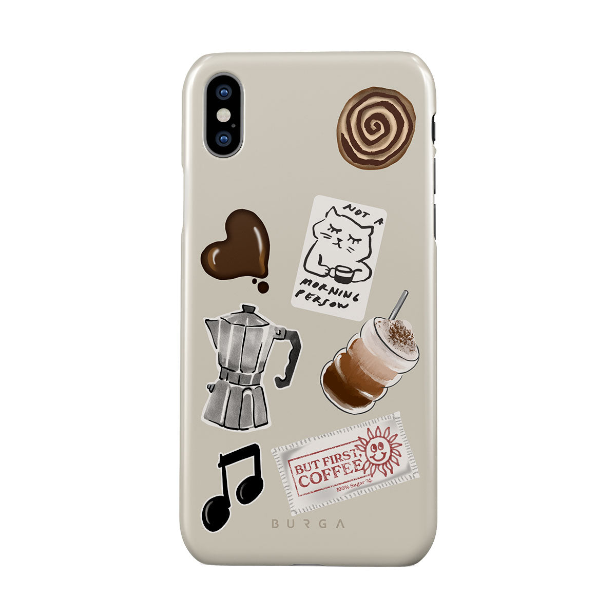 Typické pro tento motiv: moka konvičku, frappé, skořicovou rolku, čokoládové srdce, samolepku „Not a morning person“, účtenku „But First, Coffee“, notu.
