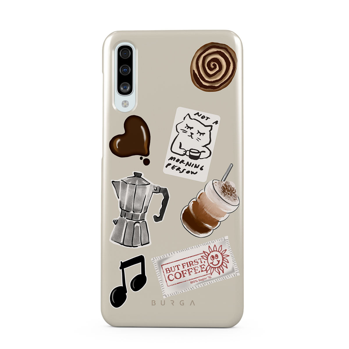 Typické pro tento motiv: moka konvičku, frappé, skořicovou rolku, čokoládové srdce, samolepku „Not a morning person“, účtenku „But First, Coffee“, notu.