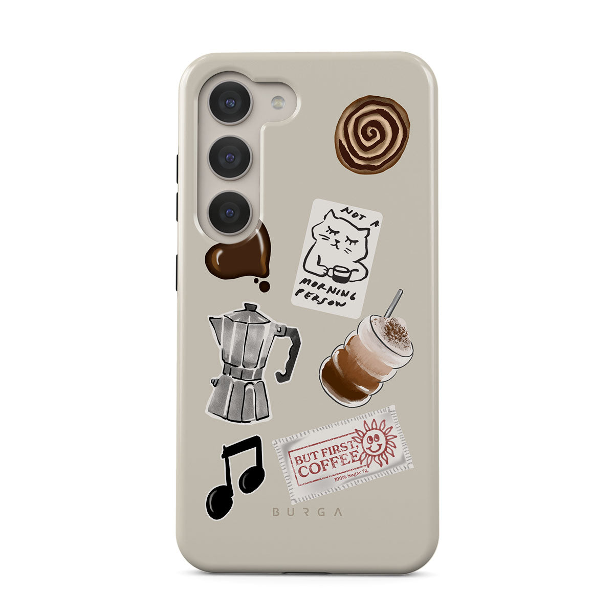 Typické pro tento motiv: moka konvičku, frappé, skořicovou rolku, čokoládové srdce, samolepku „Not a morning person“, účtenku „But First, Coffee“, notu.