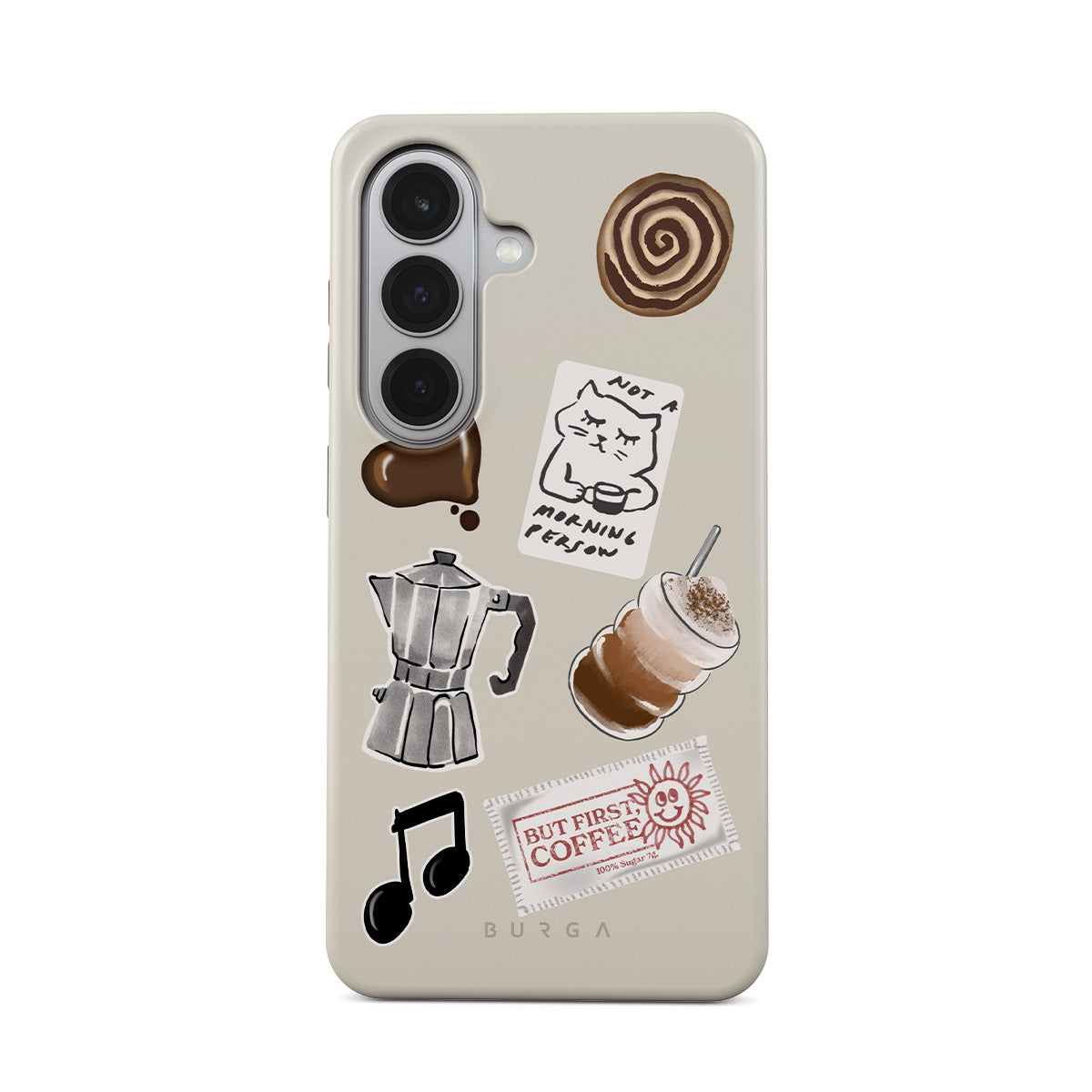 Typické pro tento motiv: moka konvičku, frappé, skořicovou rolku, čokoládové srdce, samolepku „Not a morning person“, účtenku „But First, Coffee“, notu.
